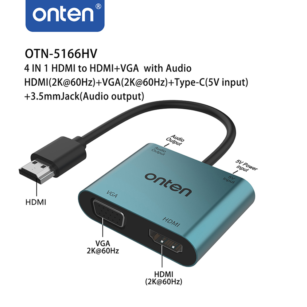 Adapter 4u1 HDMI 2K 30Hz na HDMI 2K 60Hz + VGA 2K 60Hz + USB Type-C 5V + jack 3.5mm 17cm (OTN-5166HV) Onten (MS)