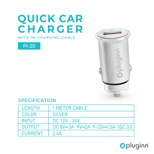Auto punjac Pluginn PI-20 QC 3.0, 3A, 18W, sa lightning kablom srebrni