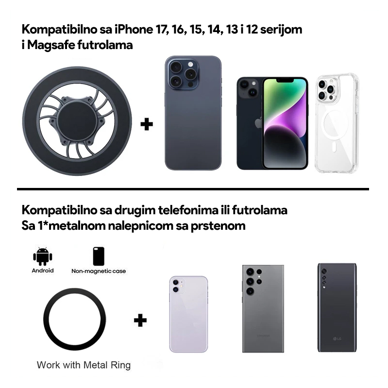 Izuzetno jak magnetni držač koji se lako kači na sprave u teretani, golf vozila, frižidere i druge metalne površine. Za ostale telefone bez MagSafe funkcije, u pakovanju dobijate metalni prsten.