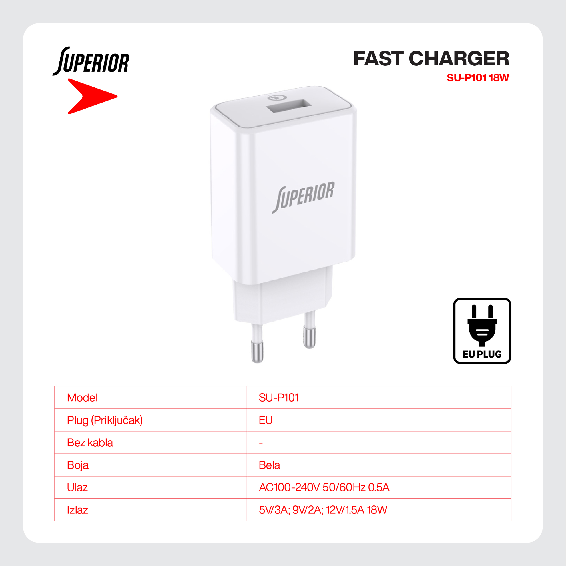 Kuciste punjaca Superior SU-P101 Fast QC3.0 18W 3A belo (MS)