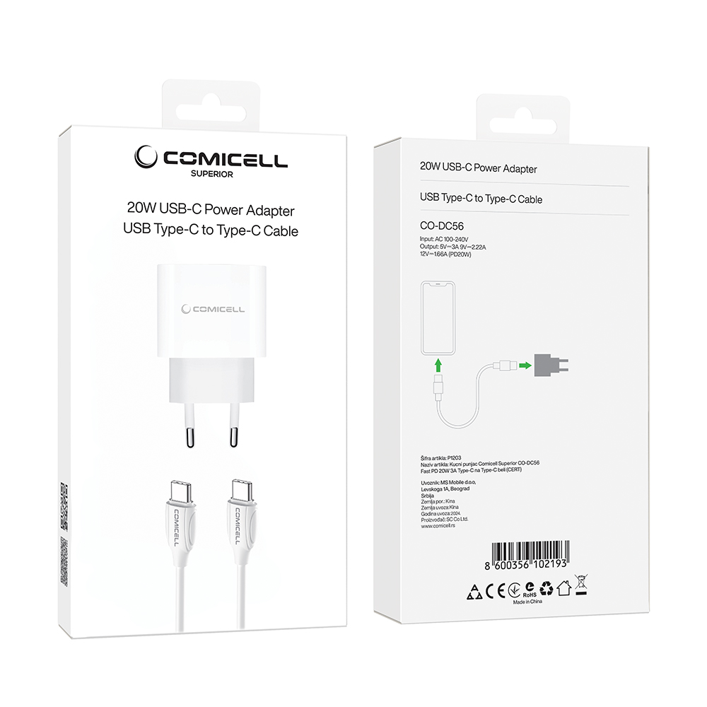 Kucni punjac za iPhone 14/13/12/11 PD Fast charger 20W 3A HQ Kucni punjac COMICELL PD Fast Charge TD-PA133 20W za Iphone 11/Iphone 12 Type C na lightning beli