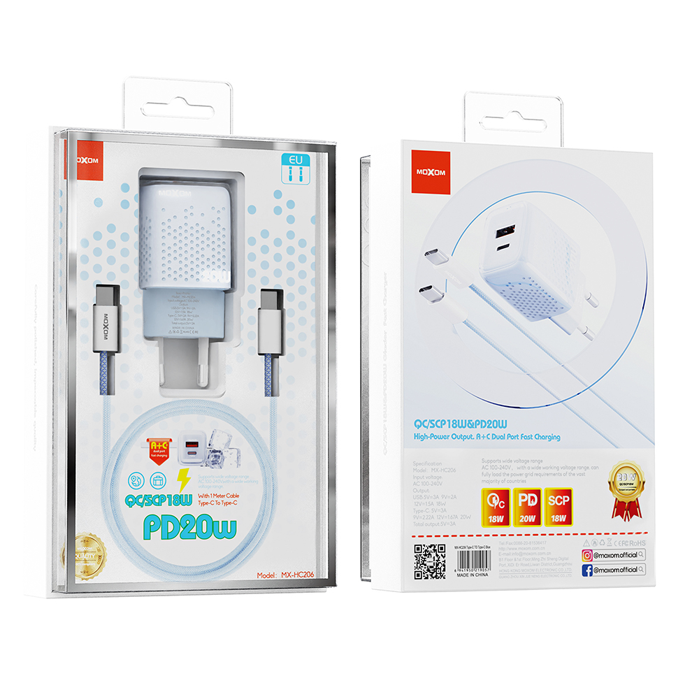 Kucni punjac Moxom MX-HC206 18W FAST PD 20W Type C na Type C plavi (MS)