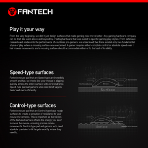 Control – type surface Gaming podloga je nezaobilazni deo arsenala modernog gejmera. Gaming podloga površine Fantech MP44 je upravo ono što nedostaje u arsenalu bilo kog igrača. 3D-teksturni dizajn površine igre vam omogućava da brzo i precizno koristite miša da biste preciznije pogodili metu ili lako kontrolišite svaki potez. Opšivene ivice površine povećavaju njegov vek trajanja. Optimizovana debljina osnove od 4 mm poboljšava prijanjanje. Prirodan, netoksičan, ekološki prihvatljiv gumeni materijal.