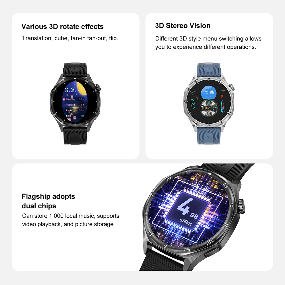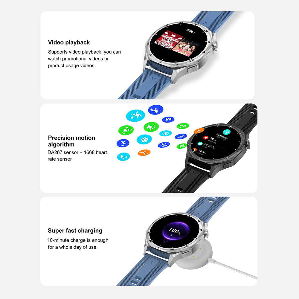 22. Funkcije: Sportski režimi rada, praćenje sna, vremenska prognoza, merenje nivoa zasićenosti kiseonikom (SpO2), vežbe disanja, kontakti, poruke, kalkulator, igre, alarm, štoperica, tajmer, lampa, opcija pronalaska uređaja, kamera, 9 stilova menija, podešavanje osvetljenja, režim čuvanja baterije (power save mode), podsetnici, 3D meni, galerija, AI glasovni asistent, TWS povezivanje, video plejer